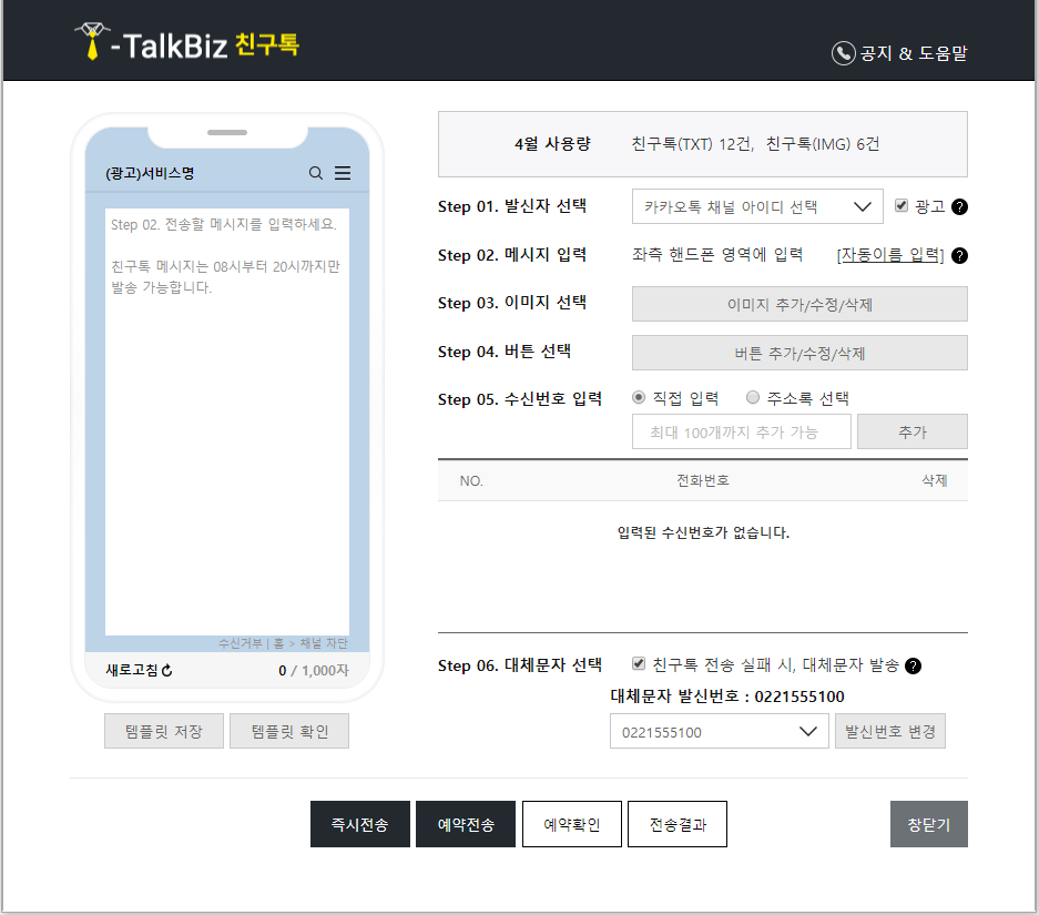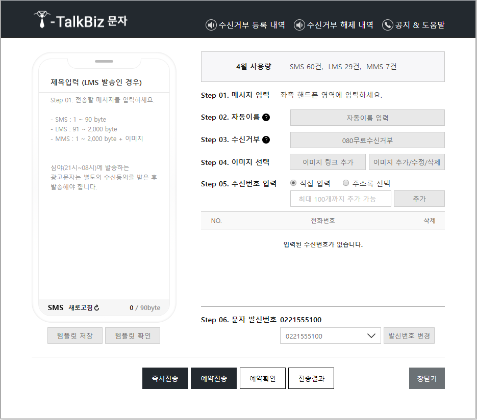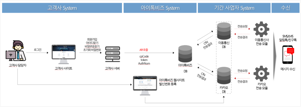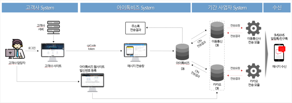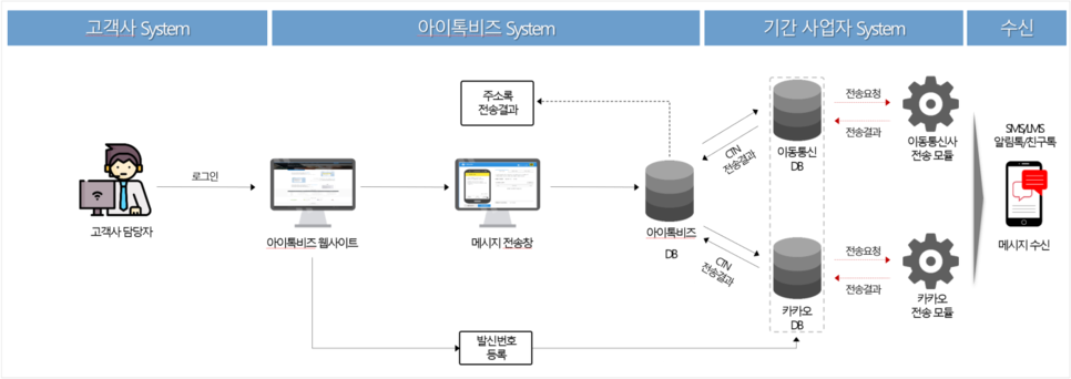 - 아이톡비즈 웹사이트를 통해 별도 시스템 구축이나 연동 없이 메시지를 전송할 수 있습니다.